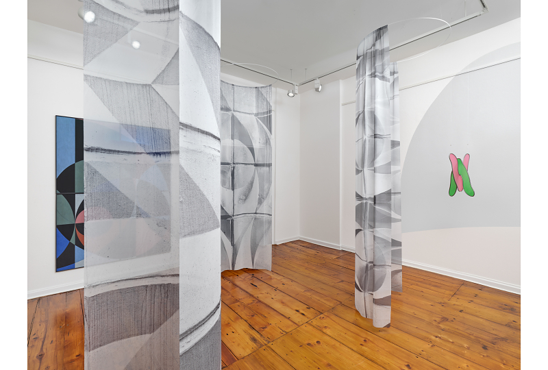 Trotz dieser Unterschiede finden sich formale und gedankliche Überschneidungen im Œuvre der beiden Künstlerinnen insbesondere in Bezug auf die abstrakte Bildsprache: Kreise, Farbflächen, Farbfamilien, modulare Systeme und rhythmische Muster tauchen in beiden Arbeiten auf. Für Fade into Form entwickeln Küchler und Streck ein gemeinsames Display, in dem keine klare Trennung zwischen ihren Positionen erfolgt. Die Werke reagieren aufeinander, überlagern sich und bilden ein offenes, begehbares Gefüge aus Malerei, Zeichnung, Installation und Video.